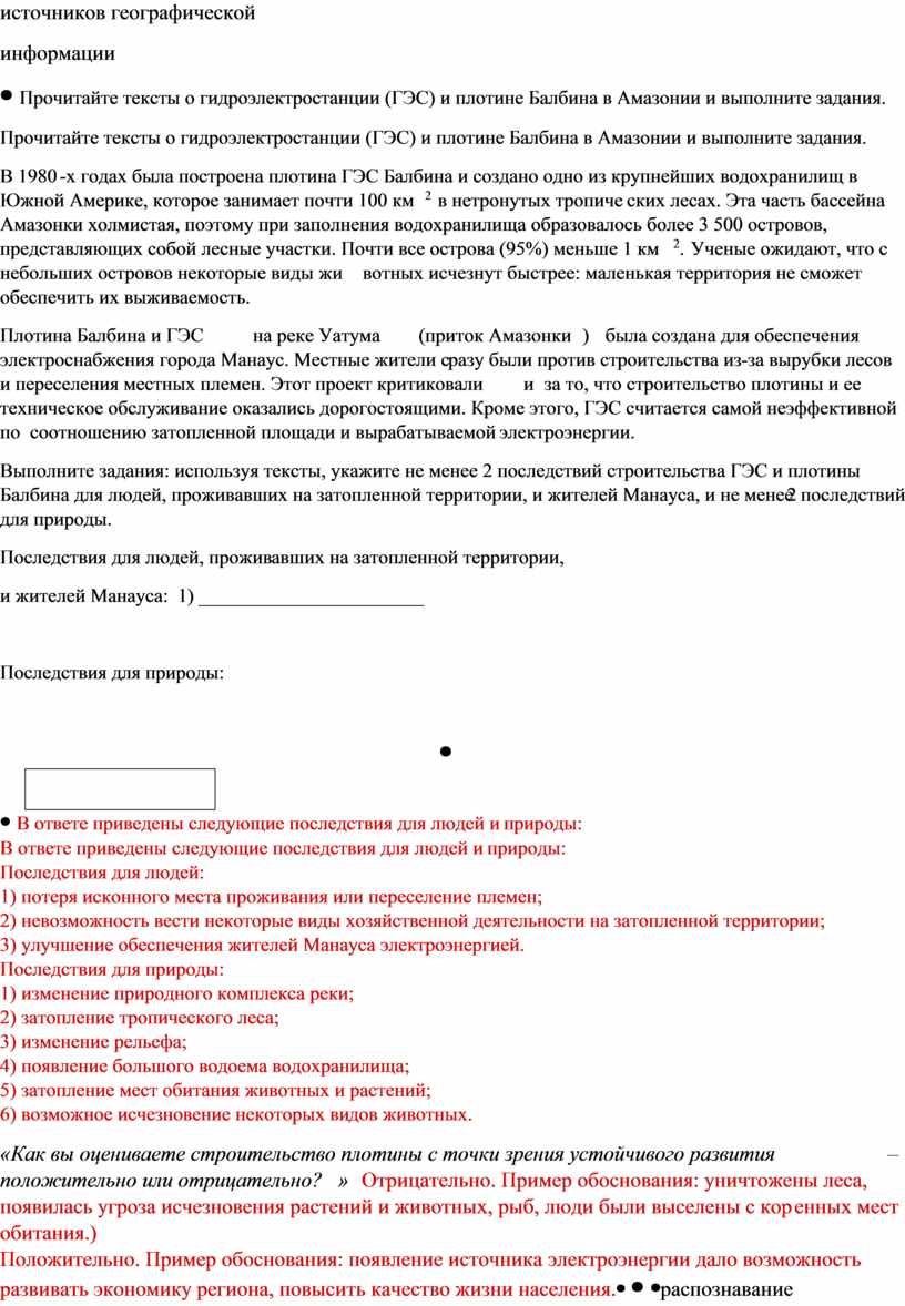 В ответе приведены следующие последствия для людей и природы: Последствия для людей: 1) потеря исконного места проживания или переселение племен; 2) невозможность вести некоторые виды хозяйственной деятельности на затопленной территории; 3) улучшение обеспечения жителей Манауса электроэнергией. Последствия для природы: 1) изменение природного комплекса реки; 2) затопление тропического леса; 3) изменение рельефа; 4) появление большого водоема водохранилища; 5) затопление мест обитания животных и растений; 6) возможное исчезновение некоторых видов животных. «Как вы оцениваете строительство плотины с точки зрения устойчивого развития – положительно или отрицательно?» Отрицательно. Пример обоснования: уничтожены леса, появилась угроза исчезновения растений и животных, рыб, люди были выселены с коренных мест обитания.) Положительно. Пример обоснования: появление источника электроэнергии дало возможность развивать экономику региона, повысить качество жизни населения. |