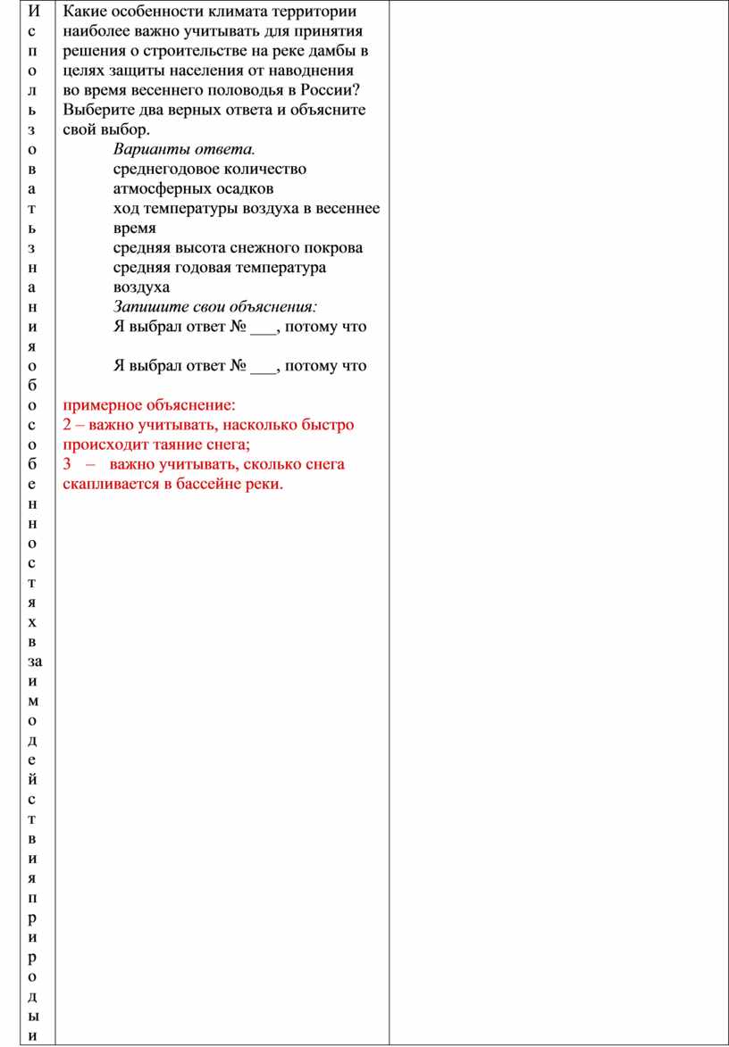 Какие особенности климата территории наиболее важно учитывать для принятия решения о строительстве на реке дамбы в целях защиты населения от наводнения во время весеннего половодья в России? Выберите два верных ответа и объясните свой выбор. Варианты ответа. 1) среднегодовое количество атмосферных осадков 2) ход температуры воздуха в весеннее время 3) средняя высота снежного покрова 4) средняя годовая температура воздуха Запишите свои объяснения: Я выбрал ответ № ___, потому что ___________________ Я выбрал ответ № ___, потому что _________ примерное объяснение: 2 – важно учитывать, насколько быстро происходит таяние снега; 3 – важно учитывать, сколько снега скапливается в бассейне реки. |