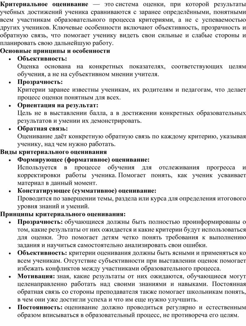 Критериальное оценивание — это система оценки, при которой результаты учебных достижений ученика сравниваются с заранее определёнными, понятными всем участникам образовательного процесса критериями, а не с успеваемостью других учеников. Ключевые особенности включают объективность, прозрачность и обратную связь, что помогает ученику видеть свои сильные и слабые стороны и планировать свою дальнейшую работу.
