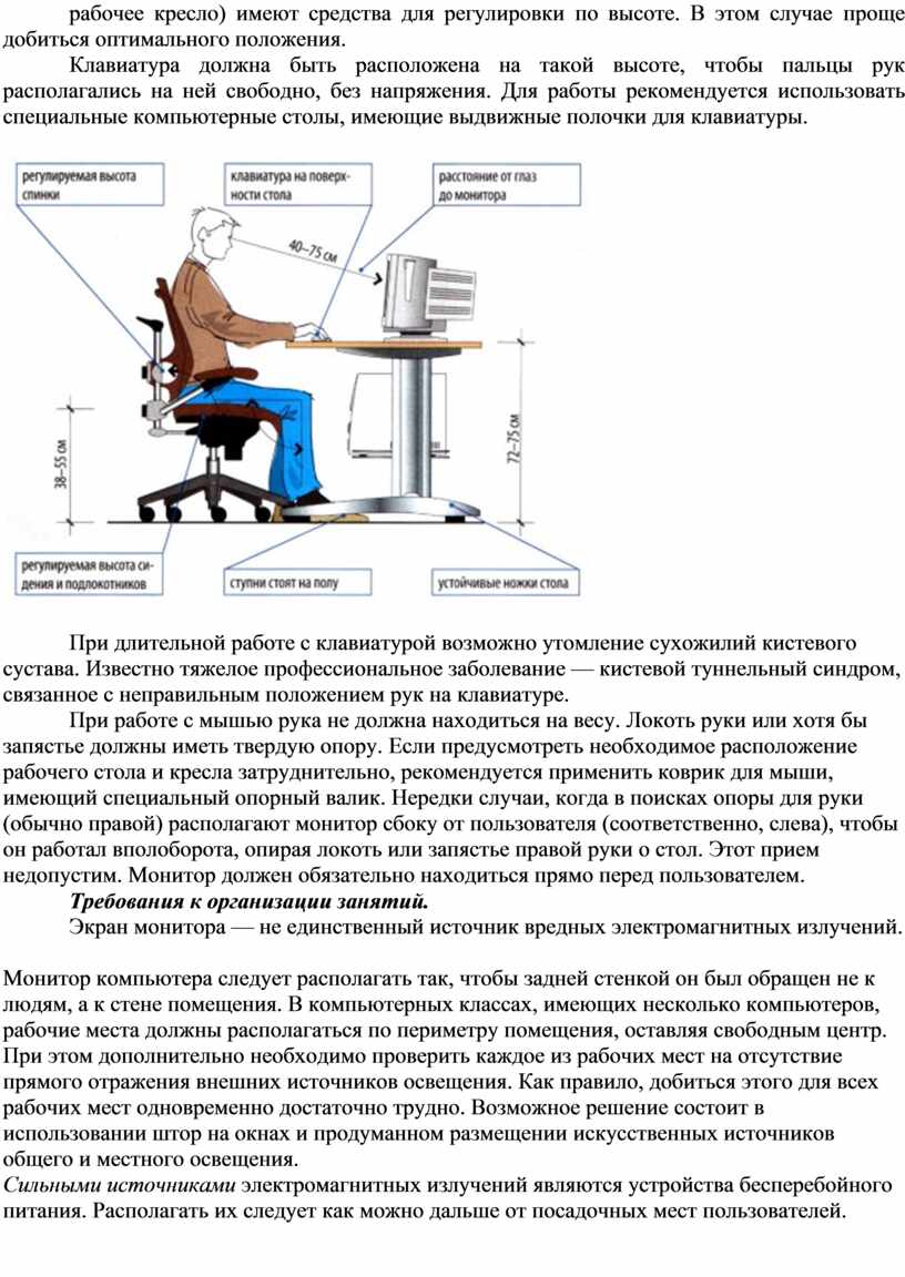 Клавиатура должна быть расположена на такой высоте, чтобы пальцы рук располагались на ней свободно, без напряжения. Для работы рекомендуется использовать специальные компьютерные столы, имеющие выдвижные полочки для клавиатуры.
