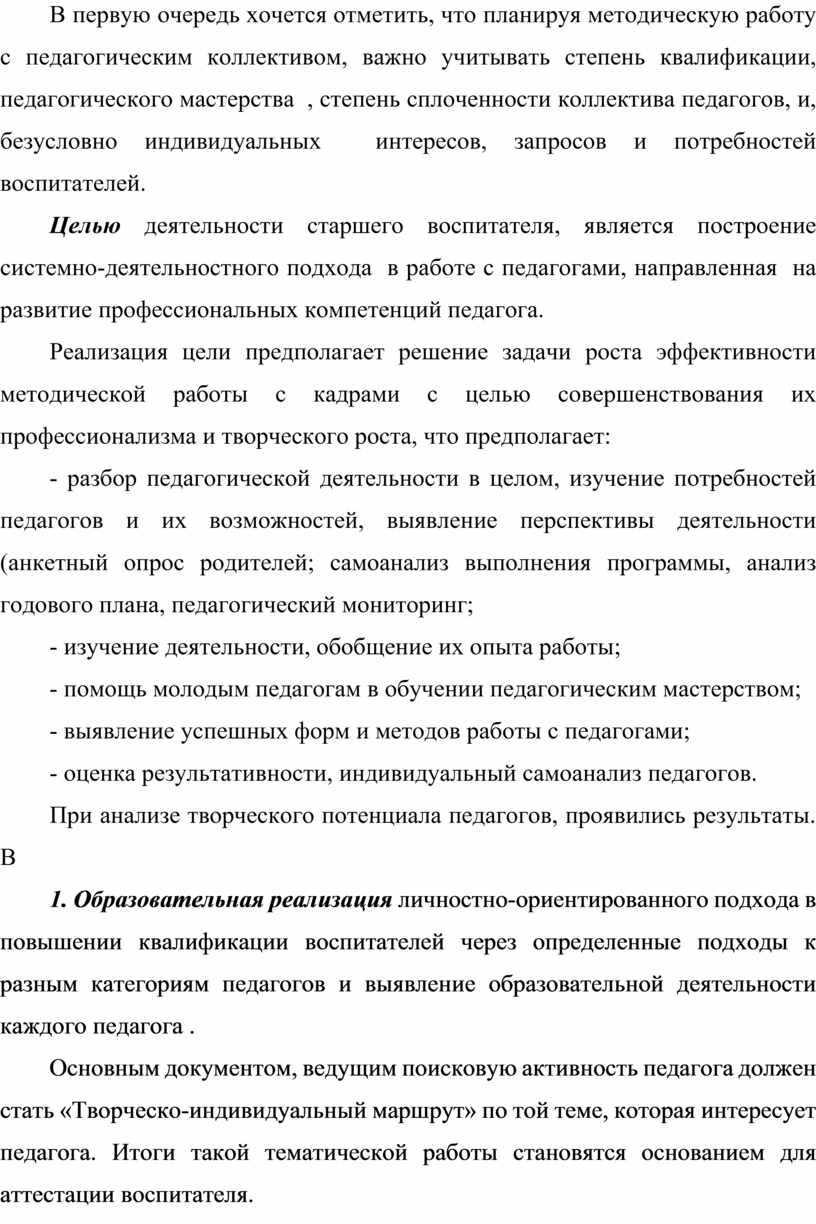 В первую очередь хочется отметить, что планируя методическую работу с педагогическим коллективом, важно учитывать степень квалификации, педагогического мастерства , степень сплоченности коллектива педагогов, и, безусловно индивидуальных интересов, запросов и потребностей воспитателей.