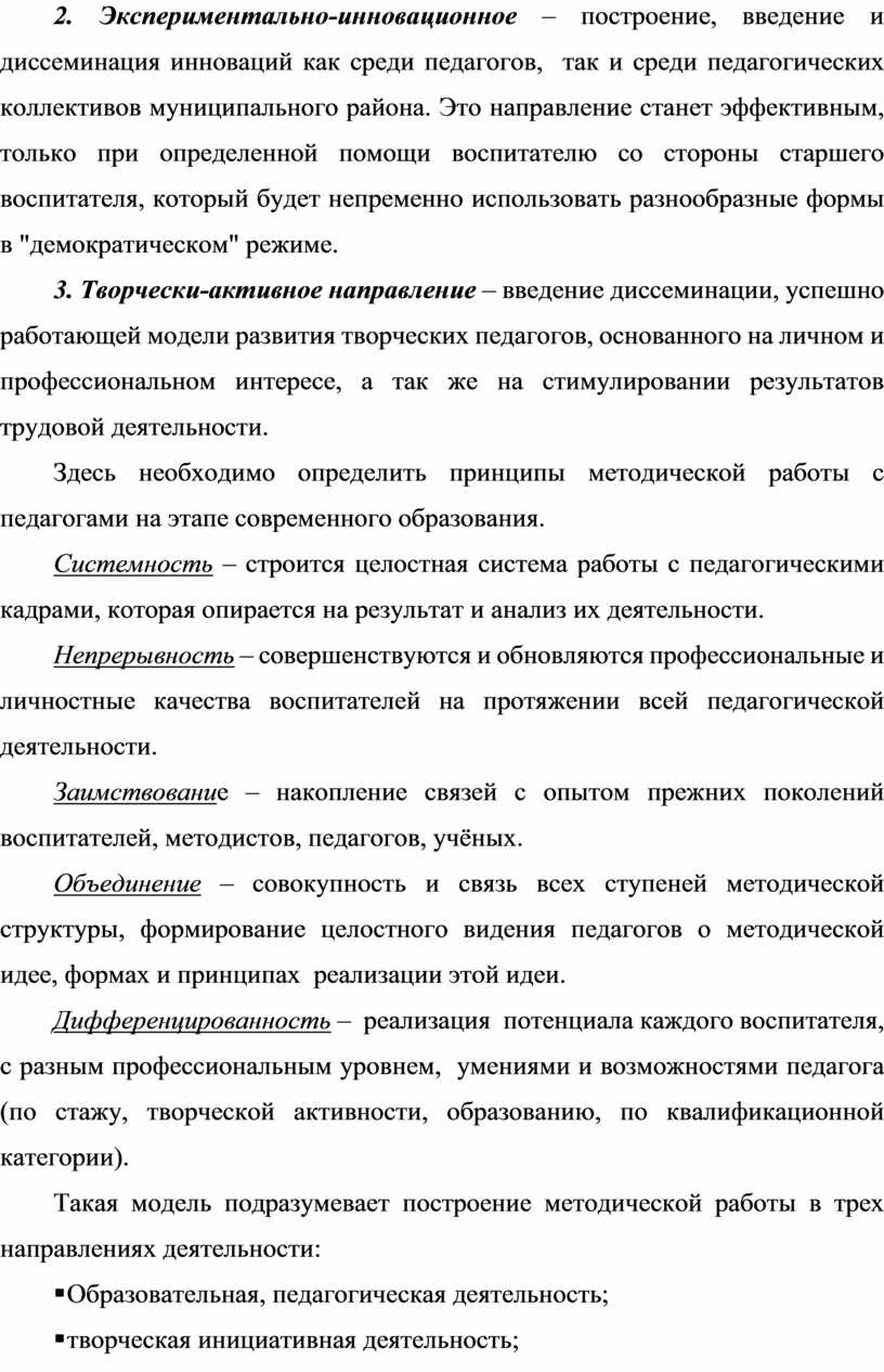 2. Экспериментально-инновационное – построение, введение и диссеминация инноваций как среди педагогов, так и среди педагогических коллективов муниципального района. Это направление станет эффективным, только при определенной помощи воспитателю со стороны старшего воспитателя, который будет непременно использовать разнообразные формы в "демократическом" режиме.