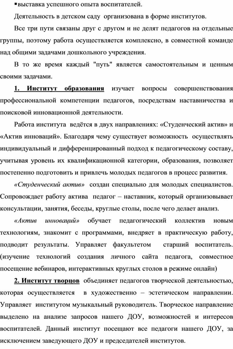 2. Институт творцов объединяет педагогов творческой деятельностью, которая осуществляется в художественно – эстетическом направлении. Управляет институтом музыкальный руководитель. Творческое направление выделено на анализе запросов нашего ДОУ, возможностей и интересов воспитателей. Данный институт посещают все педагоги нашего ДОУ, за исключением заведующего ДОУ и председателей институтов.