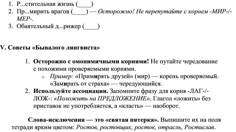 o Пример: «Примирять друзей» (мир) — корень проверяемый. «Замирать от страха» — чередующийся.
