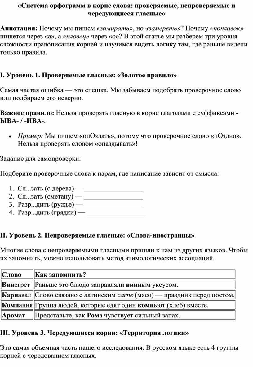 Аннотация: Почему мы пишем «замирать», но «замереть»? Почему «поплавок» пишется через «а», а «пловец» через «о»? В этой статье мы разберем три уровня сложности правописания корней и научимся видеть логику там, где раньше видели только правила.