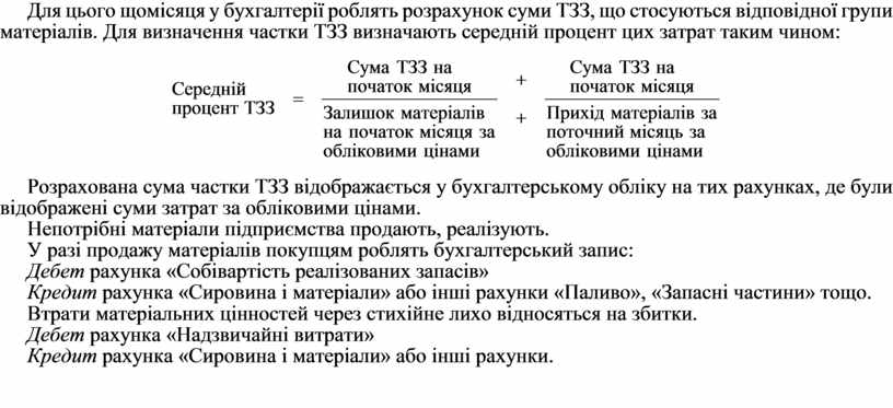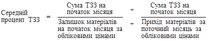 Для цього щомісяця у бухгалтерії роблять розрахунок суми ТЗЗ, що стосуються відповідної групи матеріалів. Для визначення частки ТЗЗ визначають середній процент цих затрат таким чином: