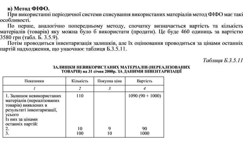 Потім проводиться інвентаризація залишків, але їх оцінювання проводиться за цінами останніх партій надходження, що унаочнює таблиця Б.3.5.11.