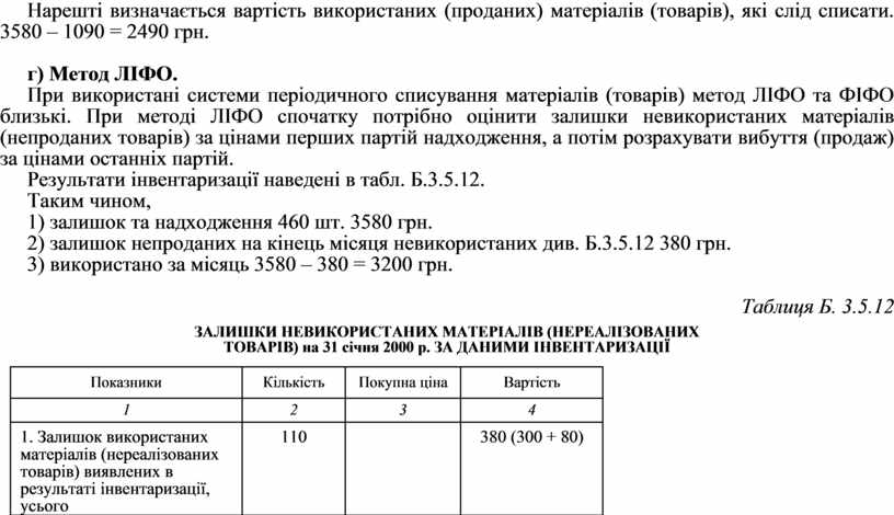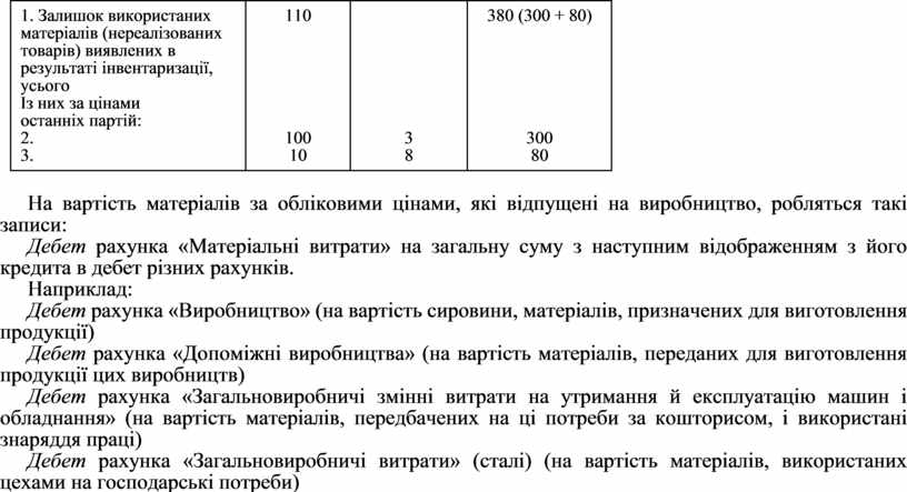 2) залишок непроданих на кінець місяця невикористаних див. Б.3.5.12 380 грн.