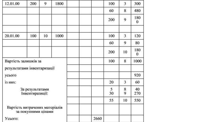 Спочатку визначається загальна кількість та сума матеріалів які можна було б використати (або продати). Це залишок на початок та придбання, (табл. Б.3.5.9). Потім, розраховується середньозважена ціна визначених вище запасів.