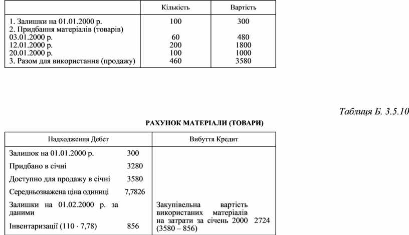 По перше, аналогічно попередньому методу, спочатку визначається вартість та кількість матеріалів (товарів) яку можна було б використати (продати). Це буде 460 одиниць за вартістю 3580 грн (табл. Б. 3.5.9).