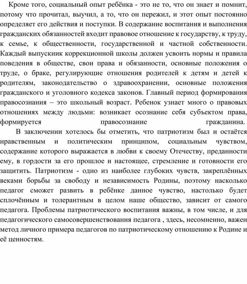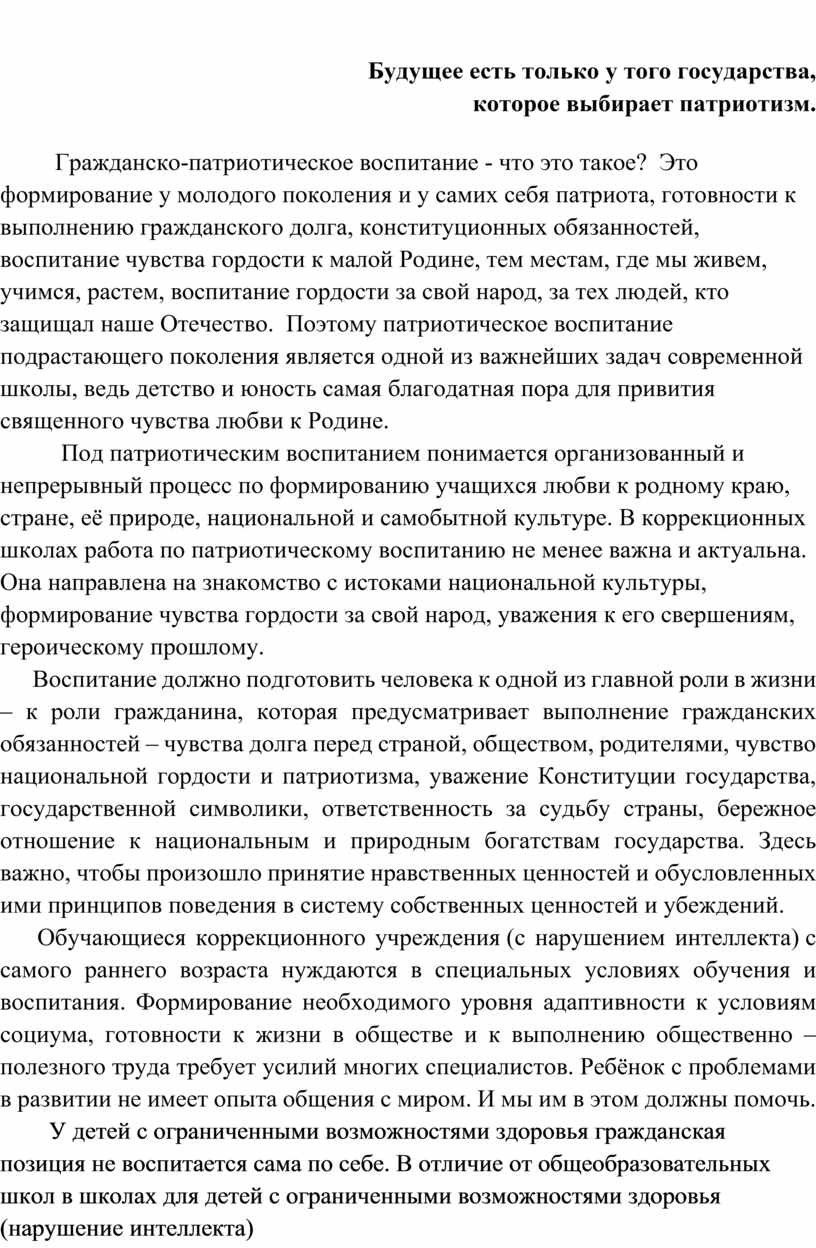 Под патриотическим воспитанием понимается организованный и непрерывный процесс по формированию учащихся любви к родному краю, стране, её природе, национальной и самобытной культуре. В коррекционных школах работа по патриотическому воспитанию не менее важна и актуальна. Она направлена на знакомство с истоками национальной культуры, формирование чувства гордости за свой народ, уважения к его свершениям, героическому прошлому.