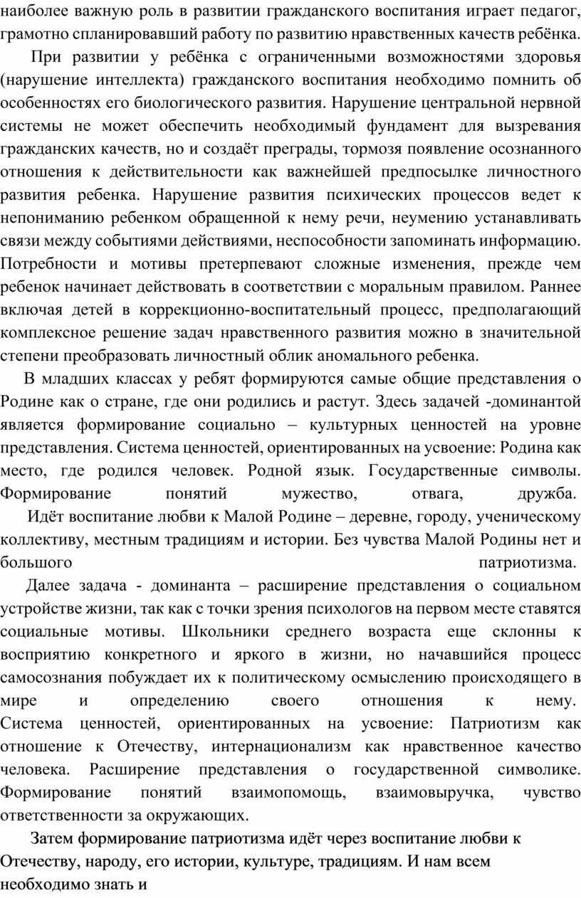 У детей с ограниченными возможностями здоровья гражданская позиция не воспитается сама по себе. В отличие от общеобразовательных школ в школах для детей с ограниченными возможностями здоровья (нарушение интеллекта) наиболее важную роль в развитии гражданского воспитания играет педагог, грамотно спланировавший работу по развитию нравственных качеств ребёнка.