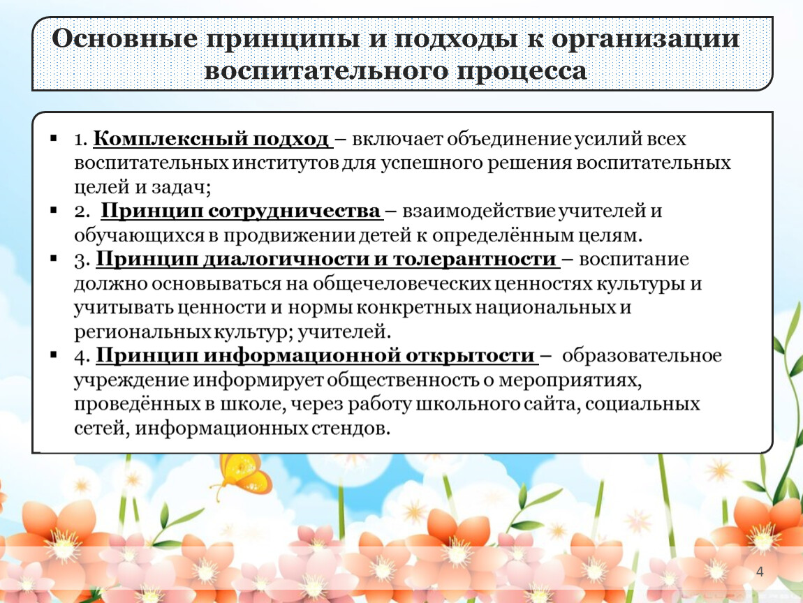 1. Комплексный подход – включает объединение усилий всех воспитательных институтов для успешного решения воспитательных целей и задач;