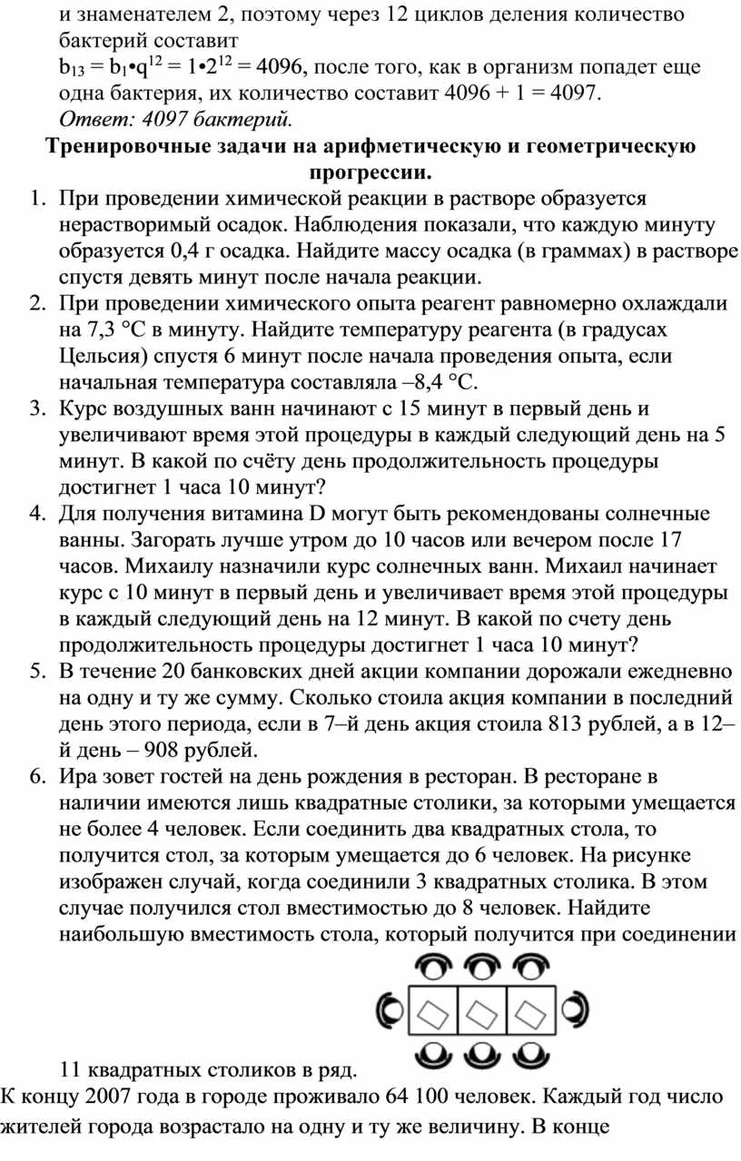 Решение: В четырех часах двенадцать 20-минутных интервалов, следовательно, произойдет 12 циклов деления бактерий. Количество бактерий составляет геометрическую прогрессию с первым членом 1 и знаменателем 2, поэтому через 12 циклов деления количество бактерий составит