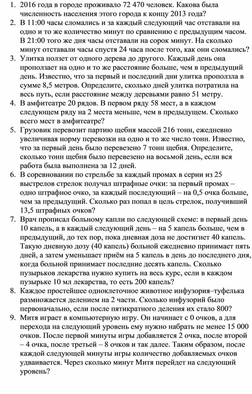7. К концу 2007 года в городе проживало 64 100 человек. Каждый год число жителей города возрастало на одну и ту же величину. В конце 2016 года в городе проживало 72 470 человек. Какова была численность населения этого города к концу 2013 года?