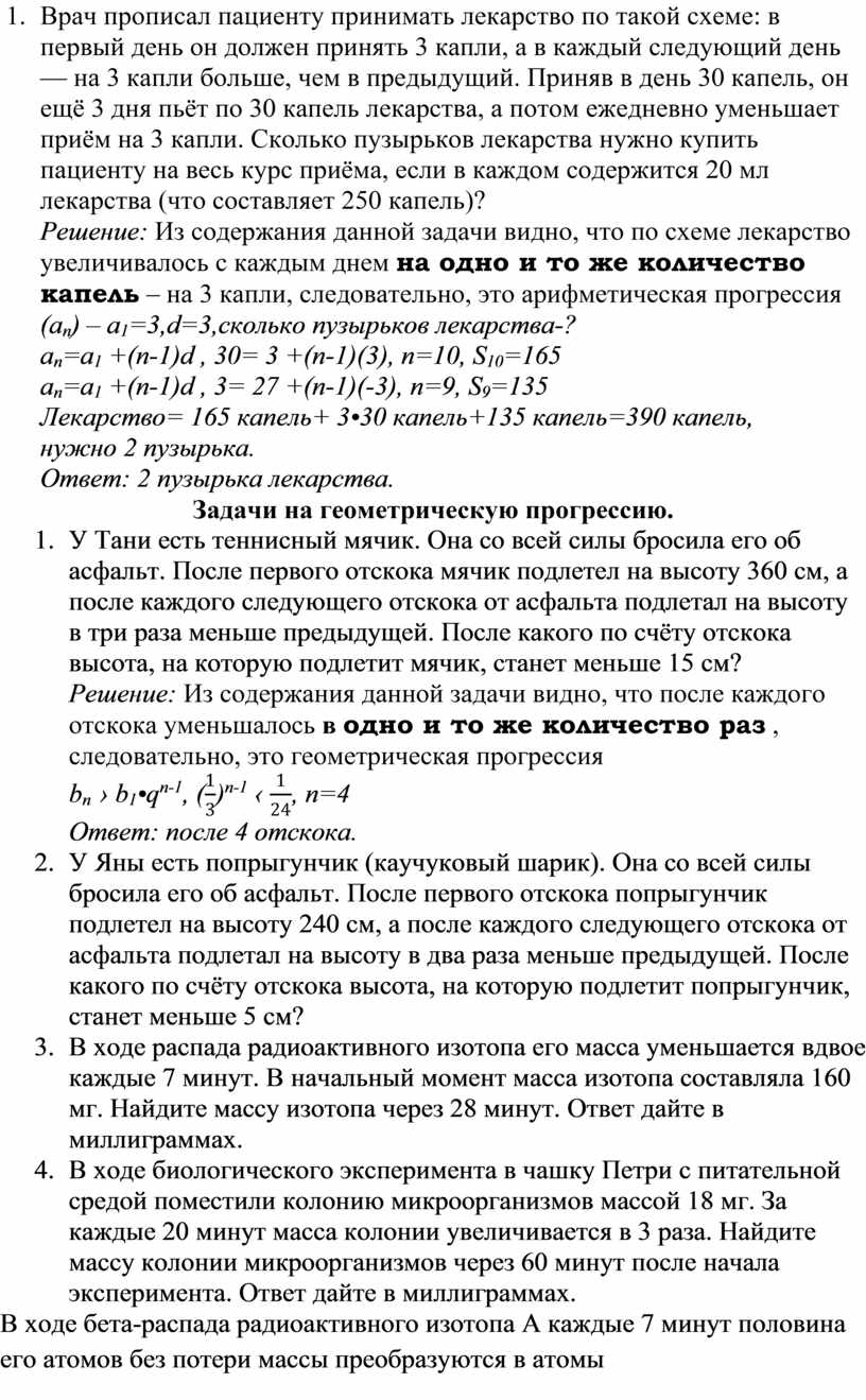Решение: Из содержания данной задачи видно, что по схеме лекарство увеличивалось с каждым днем на одно и то же количество капель – на 3 капли, следовательно, это арифметическая прогрессия