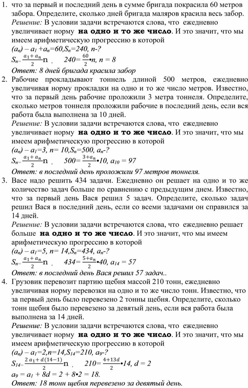 Решение: В условии задачи встречаются слова, что ежедневно решает больше на одно и то же число. И это значит, что мы имеем арифметическую прогрессию в которой