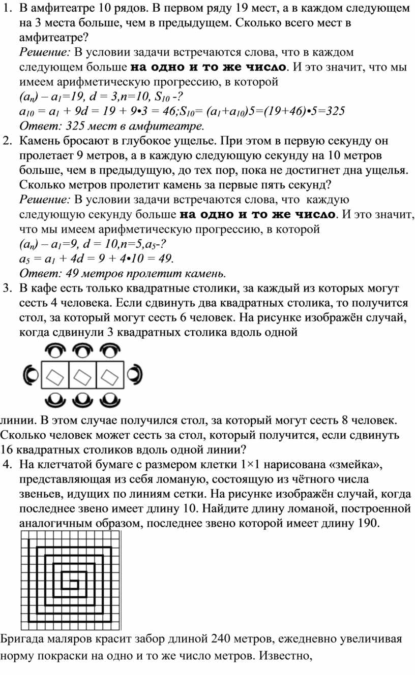 10. В амфитеатре 20 рядов. В первом ряду 58 мест, а в каждом следующем ряду на 2 места меньше, чем в предыдущем. Сколько всего мест в амфитеатре?