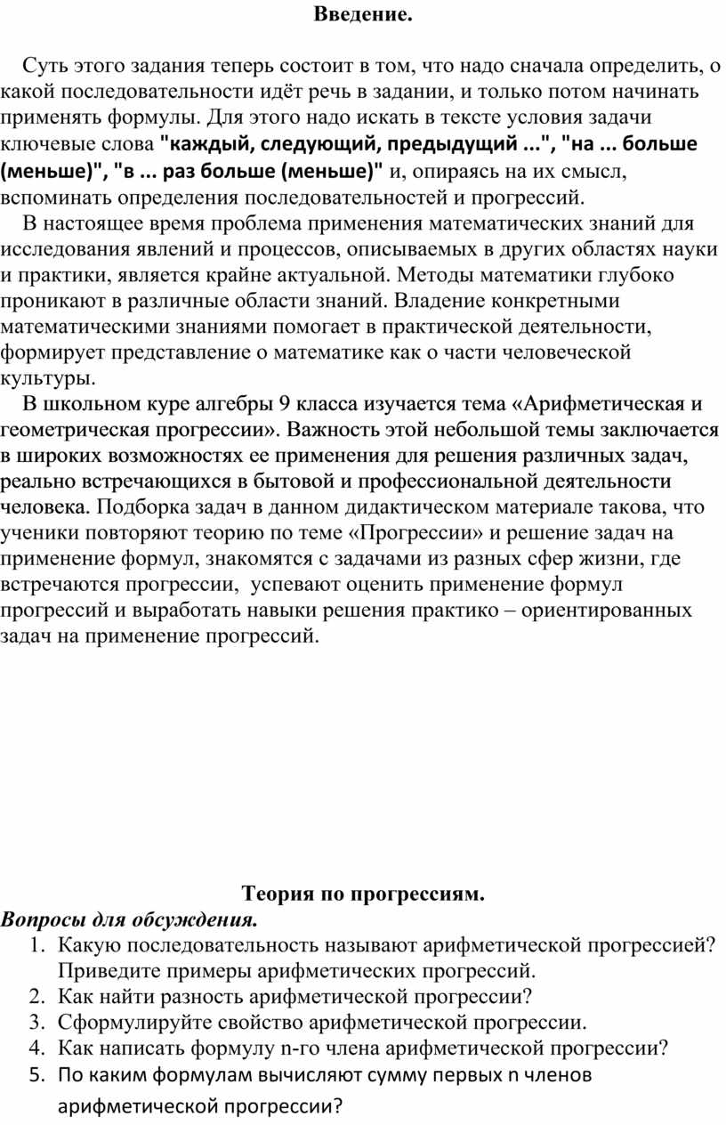 В школьном куре алгебры 9 класса изучается тема «Арифметическая и геометрическая прогрессии». Важность этой небольшой темы заключается в широких возможностях ее применения для решения различных задач, реально встречающихся в бытовой и профессиональной деятельности человека. Подборка задач в данном дидактическом материале такова, что ученики повторяют теорию по теме «Прогрессии» и решение задач на применение формул, знакомятся с задачами из разных сфер жизни, где встречаются прогрессии, успевают оценить применение формул прогрессий и выработать навыки решения практико – ориентированных задач на применение прогрессий.