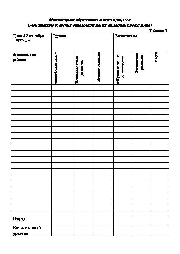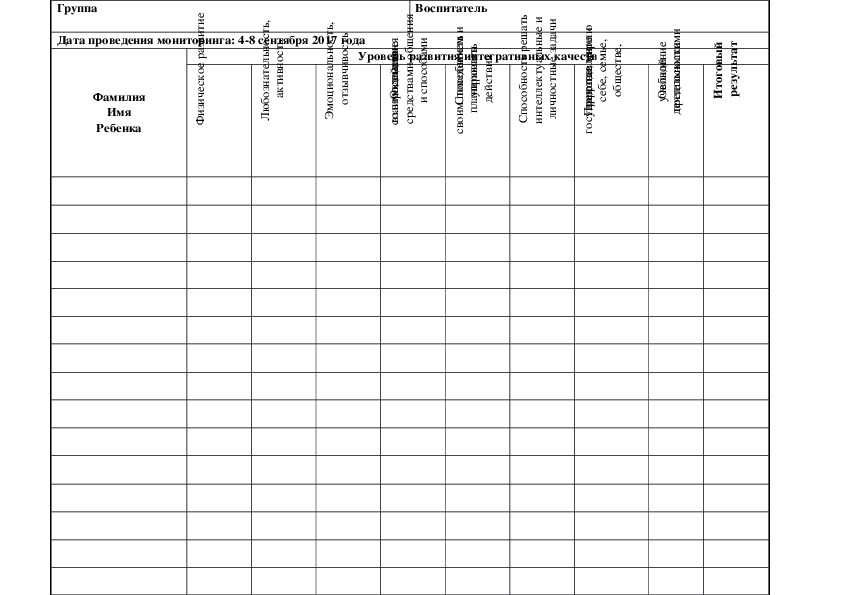 В утвержденную в ДОУ форму фиксирования результатов воспитатель