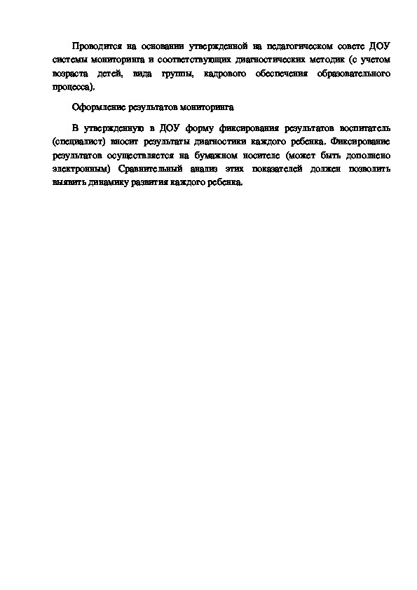 Проведение мониторинга педагогами (специалистами) ДОУПроводится на основании утвержденной на педагогическом совете ДОУ