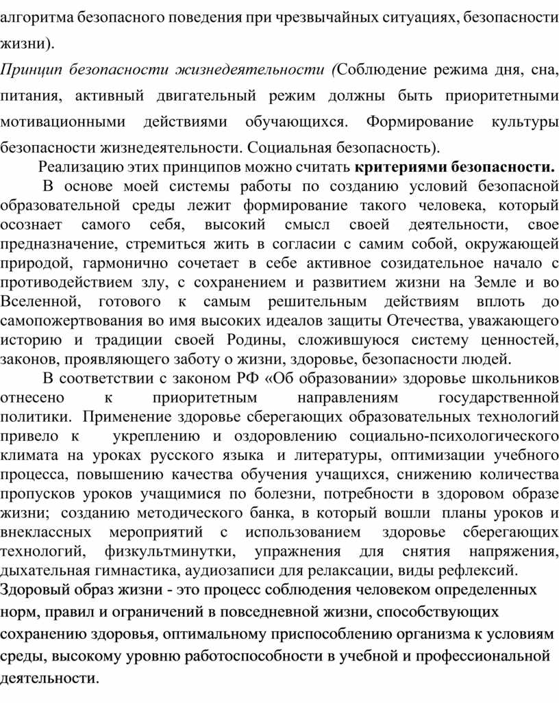 3. Принцип безопасности жизнедеятельности (Соблюдение режима дня, сна, питания, активный двигательный режим должны быть приоритетными мотивационными действиями обучающихся. Формирование культуры безопасности жизнедеятельности. Социальная безопасность).