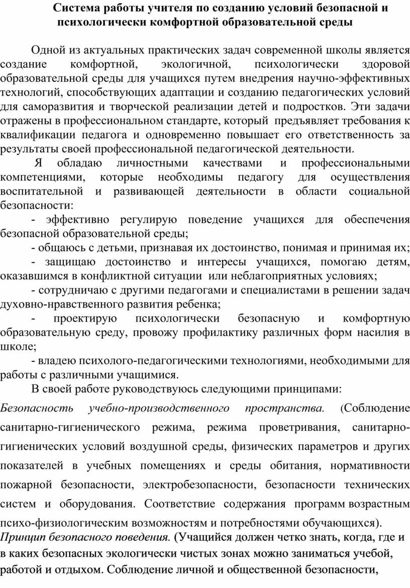Система работы учителя по созданию условий безопасной и психологически комфортной образовательной среды