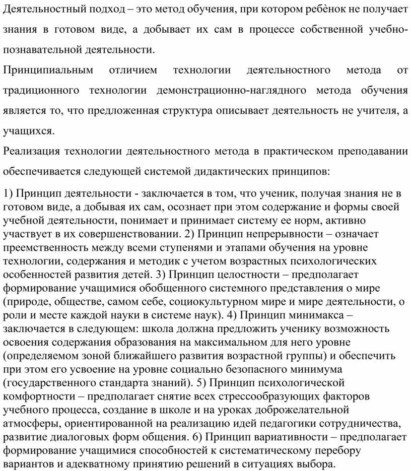 1) Принцип деятельности - заключается в том, что ученик, получая знания не в готовом виде, а добывая их сам, осознает при этом содержание и формы своей учебной деятельности, понимает и принимает систему ее норм, активно участвует в их совершенствовании. 2) Принцип непрерывности – означает преемственность между всеми ступенями и этапами обучения на уровне технологии, содержания и методик с учетом возрастных психологических особенностей развития детей. 3) Принцип целостности – предполагает формирование учащимися обобщенного системного представления о мире (природе, обществе, самом себе, социокультурном мире и мире деятельности, о роли и месте каждой науки в системе наук). 4) Принцип минимакса – заключается в следующем: школа должна предложить ученику возможность освоения содержания образования на максимальном для него уровне (определяемом зоной ближайшего развития возрастной группы) и обеспечить при этом его усвоение на уровне социально безопасного минимума (государственного стандарта знаний). 5) Принцип психологической комфортности – предполагает снятие всех стрессообразующих факторов учебного процесса, создание в школе и на уроках доброжелательной атмосферы, ориентированной на реализацию идей педагогики сотрудничества, развитие диалоговых форм общения. 6) Принцип вариативности – предполагает формирование учащимися способностей к систематическому перебору вариантов и адекватному принятию решений в ситуациях выбора.