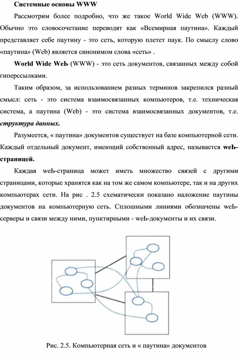 Рассмотрим более подробно, что же такое World Wide Web (WWW). Обычно это словосочетание переводят как «Всемирная паутина». Каждый представляет себе паутину - это сеть, которую плетет паук. По смыслу слово «паутина» (Web) является синонимом слова «сеть» .
