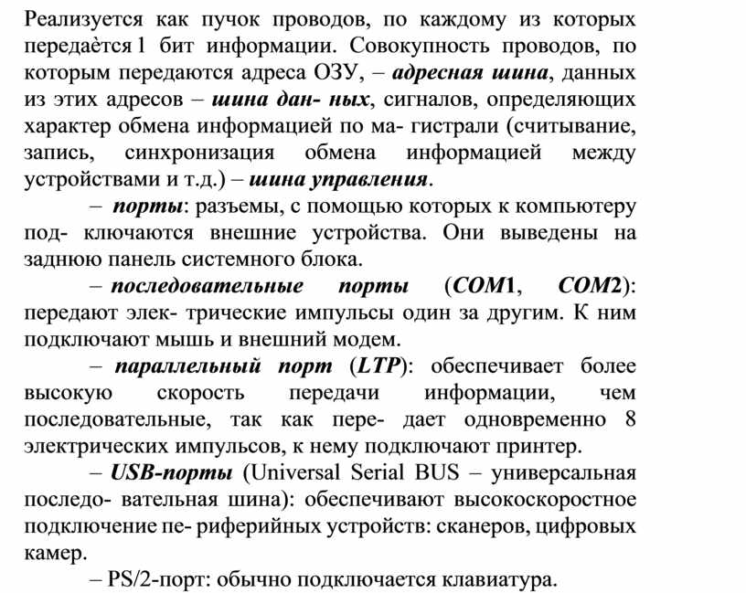 – последовательные порты (COM1, COM2): передают элек- трические импульсы один за другим. К ним подключают мышь и внешний модем.