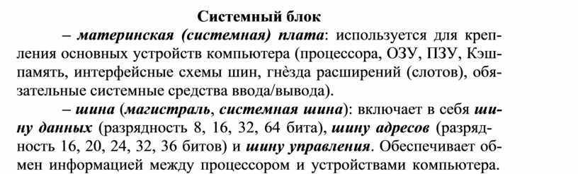 – материнская (системная) плата: используется для креп- ления основных устройств компьютера (процессора, ОЗУ, ПЗУ, Кэш- память, интерфейсные схемы шин, гнѐзда расширений (слотов), обя- зательные системные средства ввода/вывода).