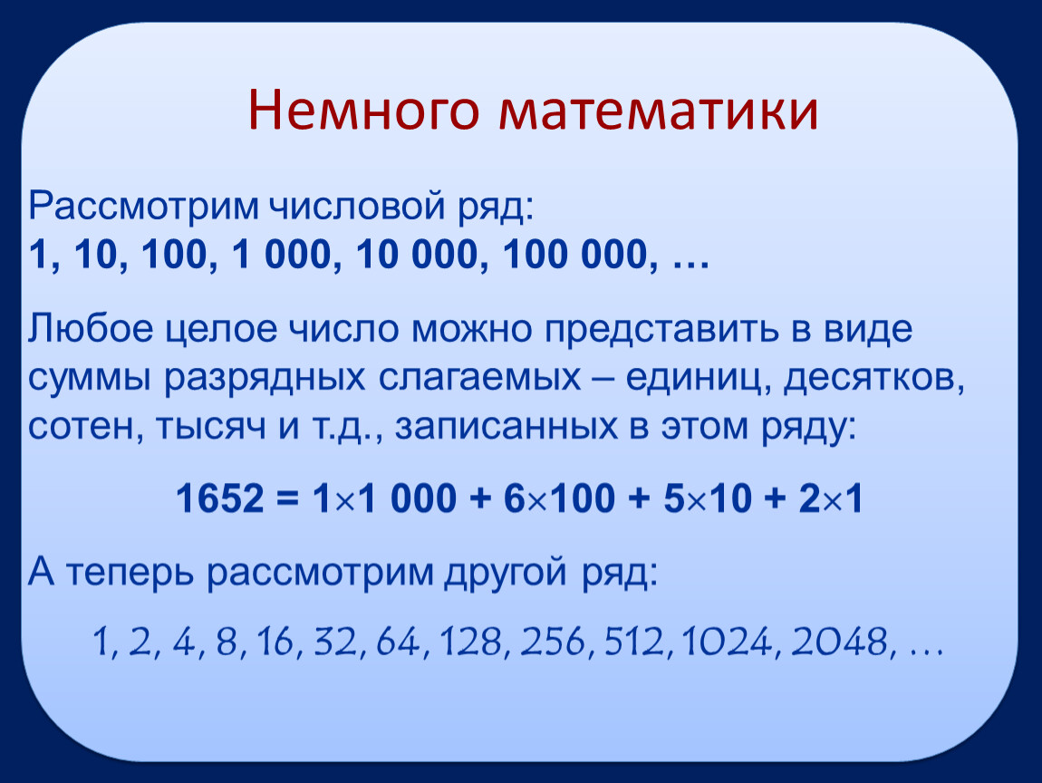 Любое целое число можно представить в виде суммы разрядных слагаемых – единиц, десятков, сотен, тысяч и т.д., записанных в этом ряду: