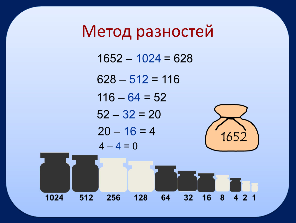 На одну чашу весов ставим груз, а на другую – гирьку с весом, ближайшим к весу груза, но не превышающим его. Найдем разность:1652 – 1024 = 628.
