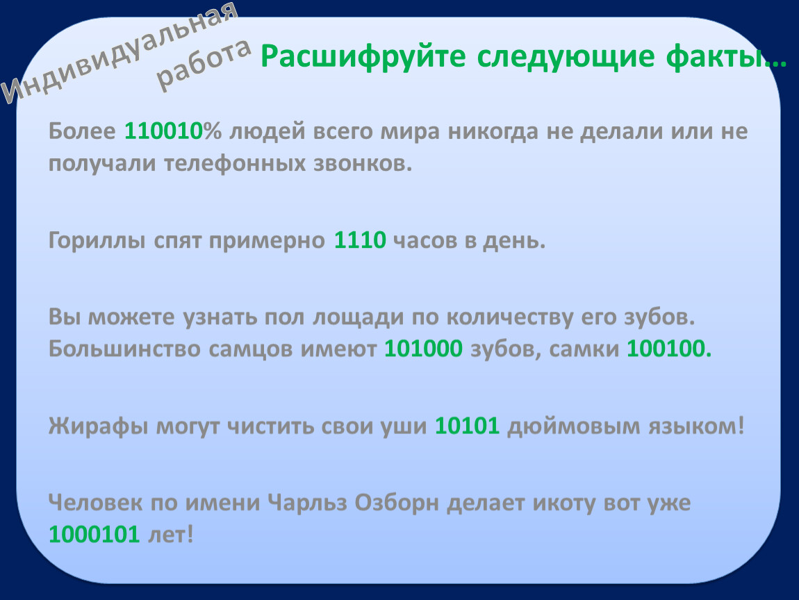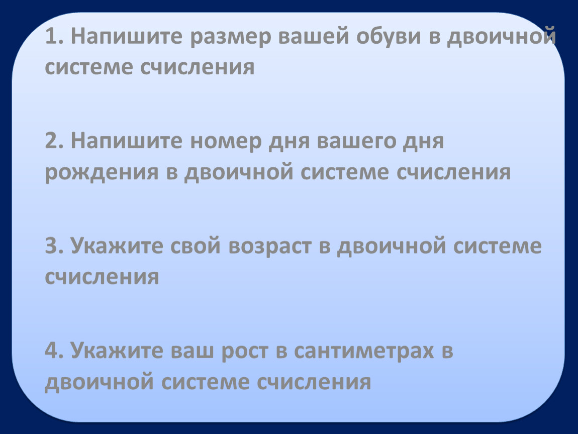 1. Напишите размер вашей обуви в двоичной системе счисления