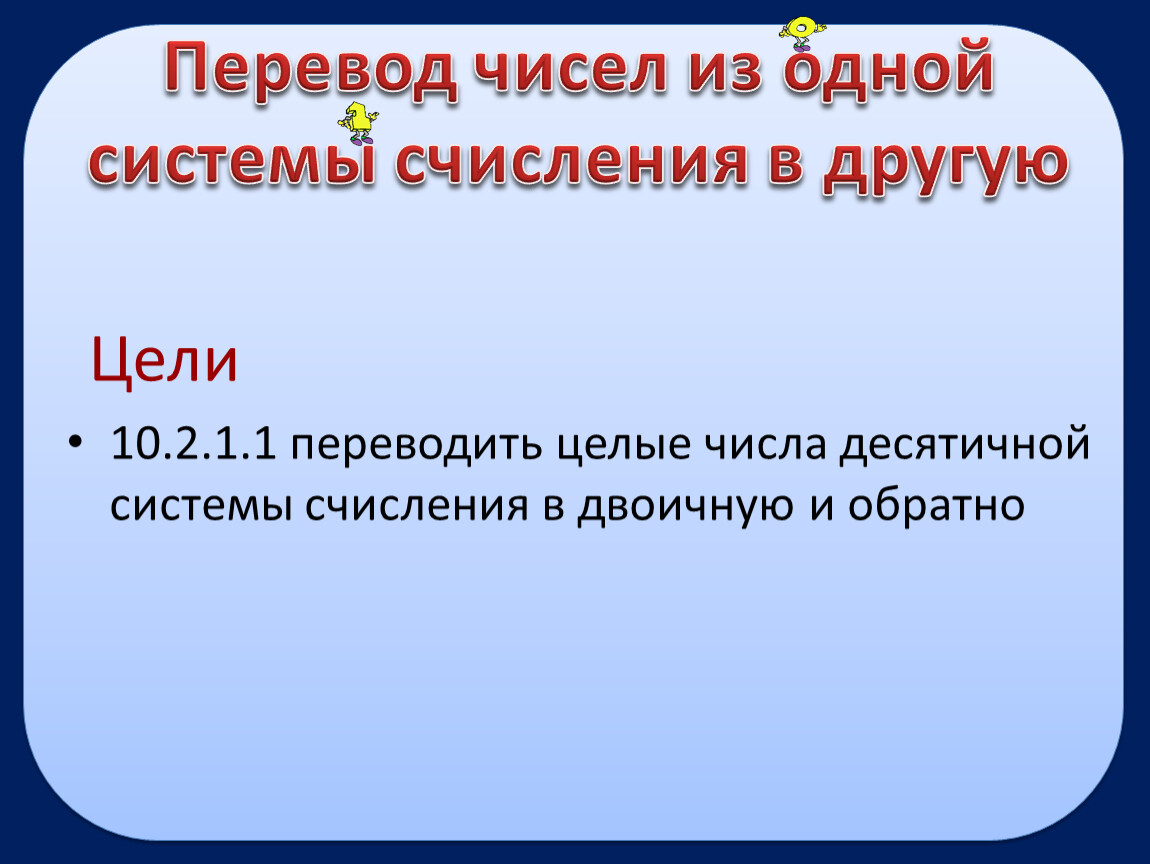 10.2.1.1 переводить целые числа десятичной системы счисления в двоичную и обратно