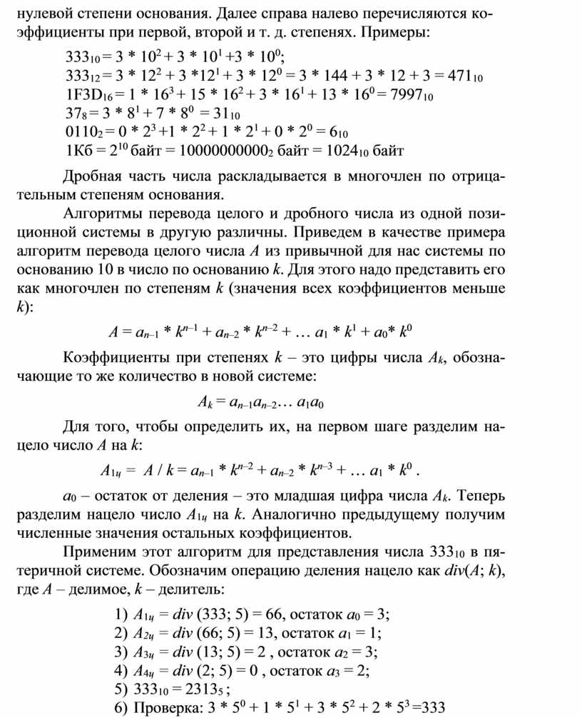 Алгоритмы перевода целого и дробного числа из одной пози- ционной системы в другую различны. Приведем в качестве примера алгоритм перевода целого числа А из привычной для нас системы по основанию 10 в число по основанию k. Для этого надо представить его как многочлен по степеням k (значения всех коэффициентов меньше k):