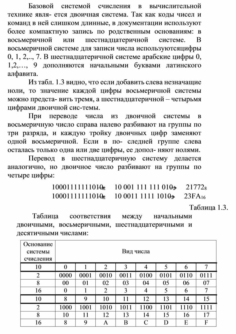 Из табл. 1.3 видно, что если добавить слева незначащие ноли, то значение каждой цифры восьмеричной системы можно предста- вить тремя, а шестнадцатеричной – четырьмя цифрами двоичной сис- темы.