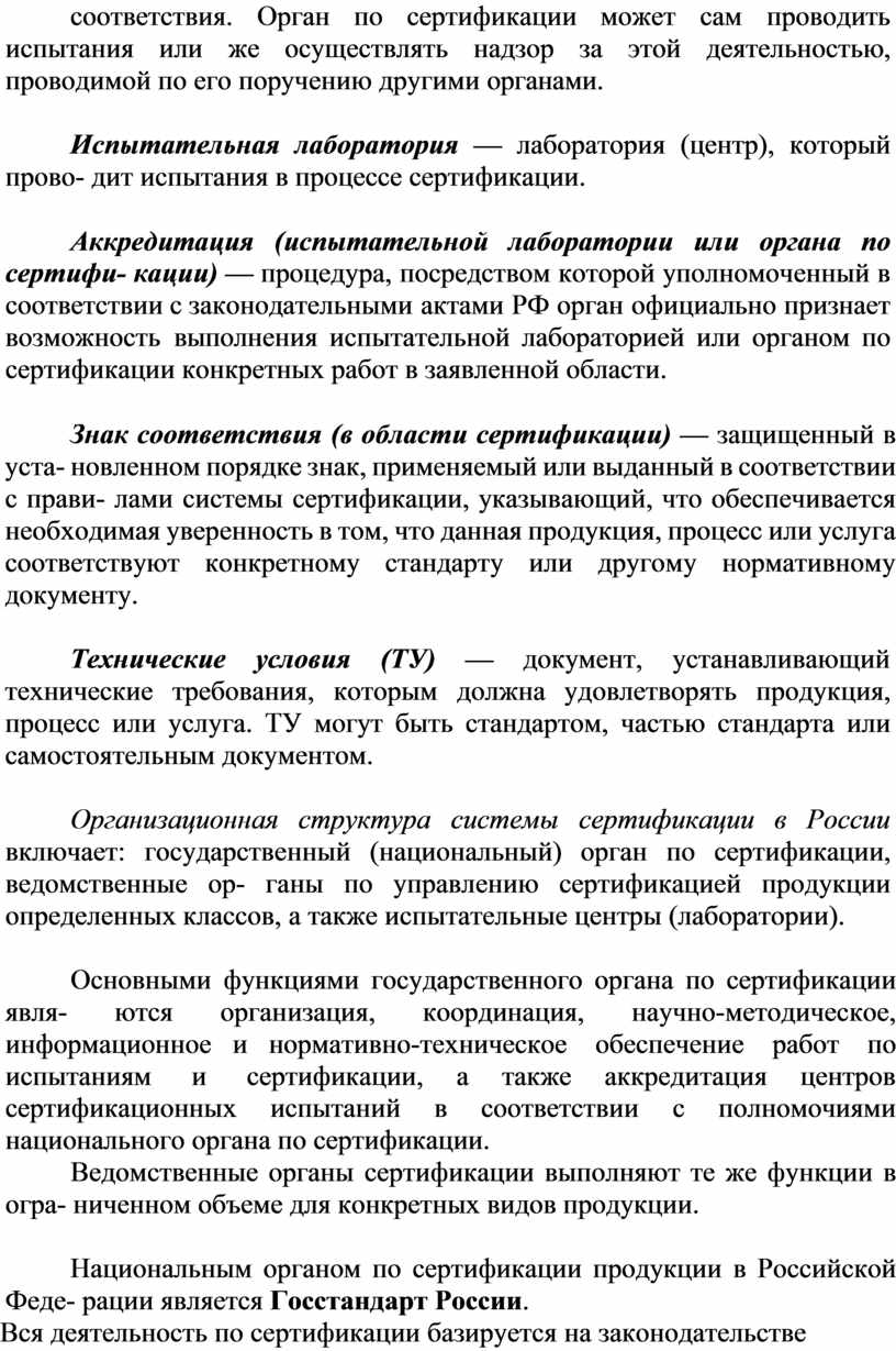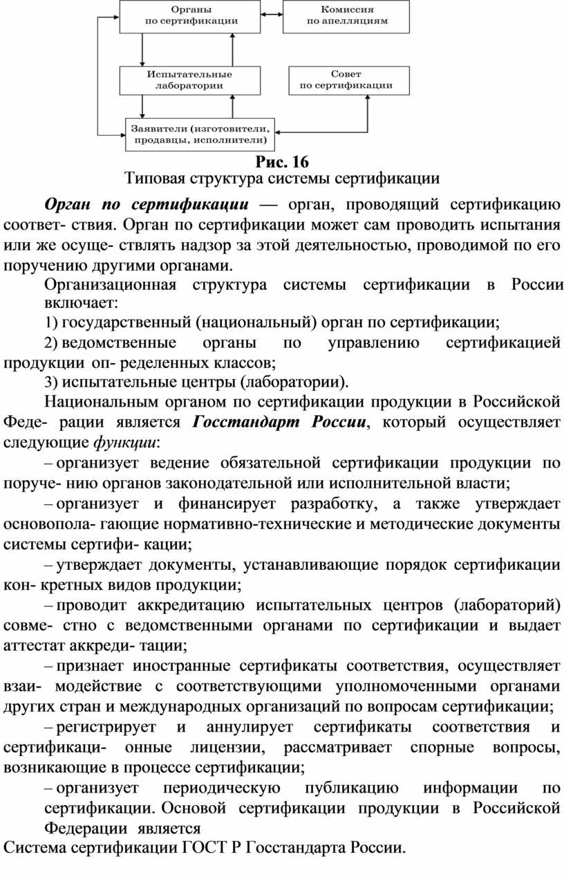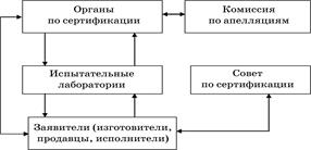 Организационная структура системы сертификации в России включает: государственный (национальный) орган по сертификации, ведомственные ор- ганы по управлению сертификацией продукции определенных классов, а также испытательные центры (лаборатории).