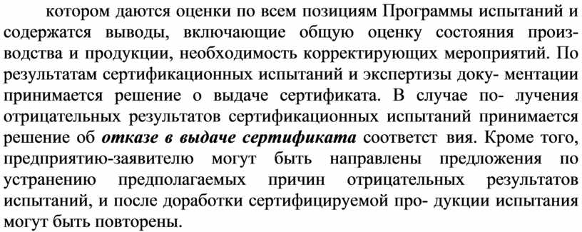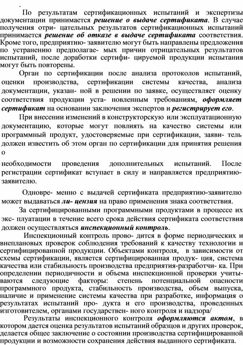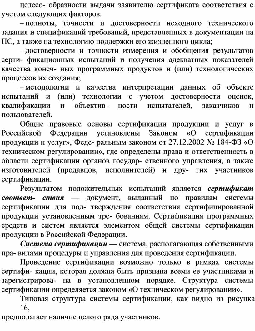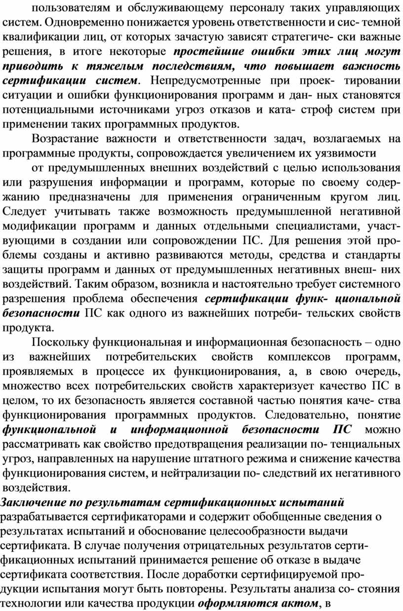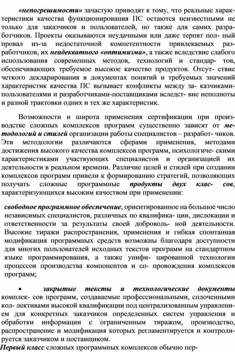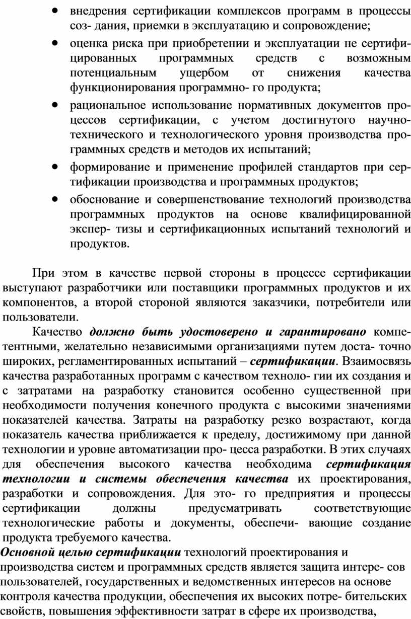 На практике акцент, распределение ресурсов и усилий на эти два вида сертификации зависят от особенностей характеристик ком- плекса программ, квалификации коллектива специалистов – разработчиков, требований заказчика – потребителей и наличия сертификационной лаборатории соответствующей тематической квалификации. Для этого организация и процессы сертификации должны специализироваться на определенные виды сертификации и на определенные классы программных продуктов, предусматривать соответствующие технологические работы и документы, обеспечивающие создание продукта требуемого качества.