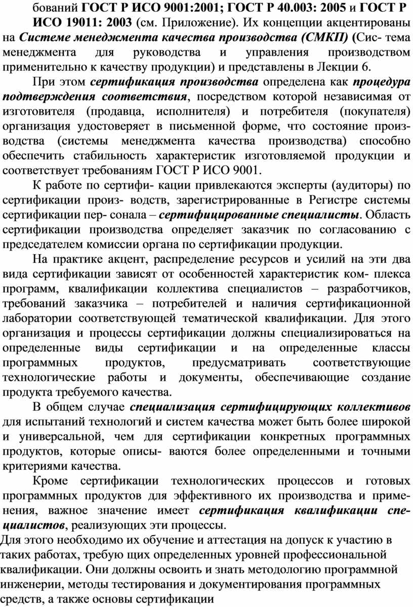 Наиболее полно в России стандартизирована сертификация производства продукции различных видов. Она поддержана стандар- тами: Временный порядок сертификации производств с учетом тре- бований ГОСТ Р ИСО 9001:2001; ГОСТ Р 40.003: 2005 и ГОСТ Р