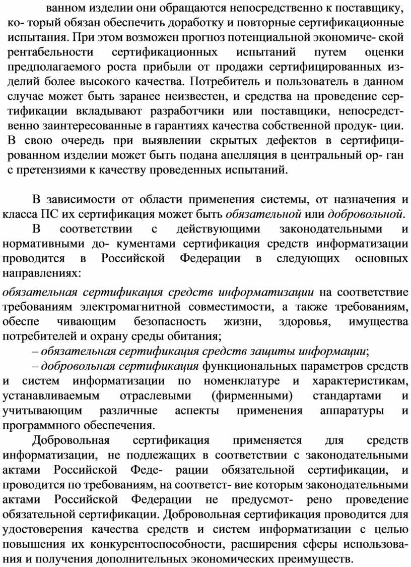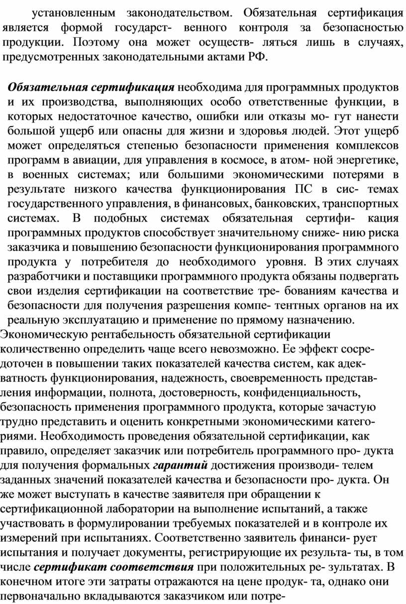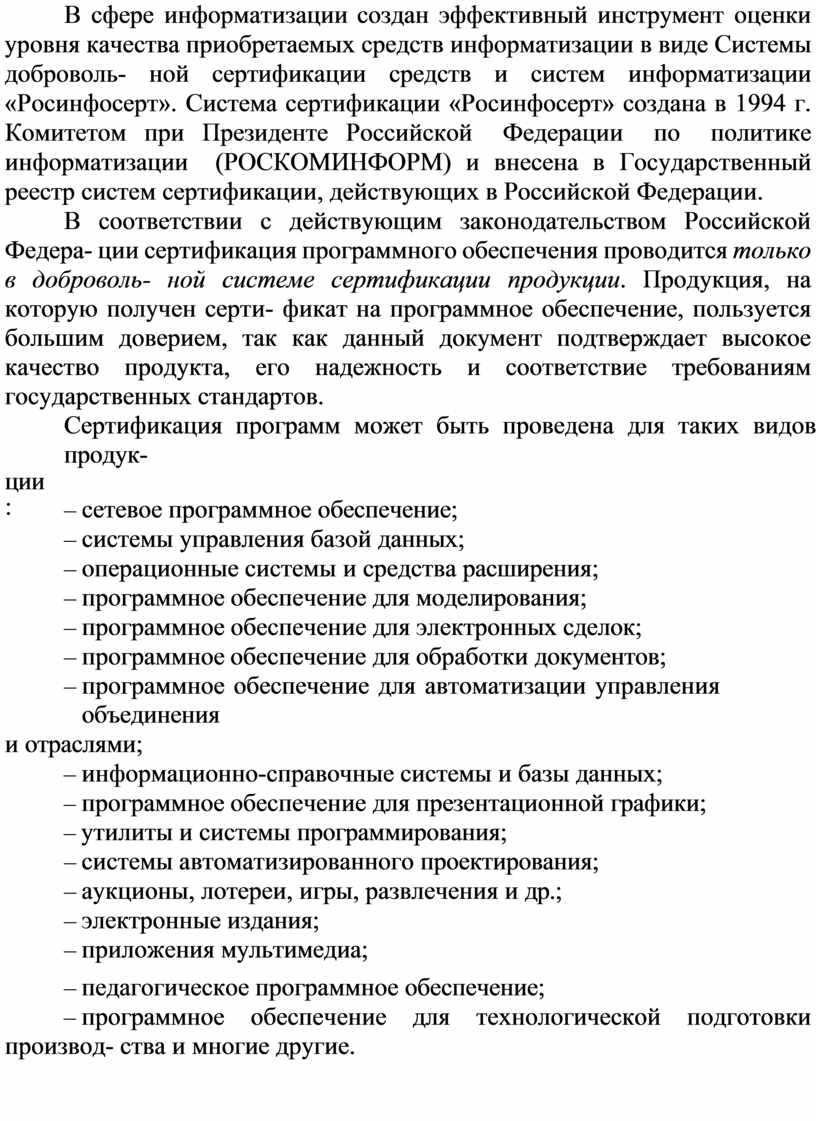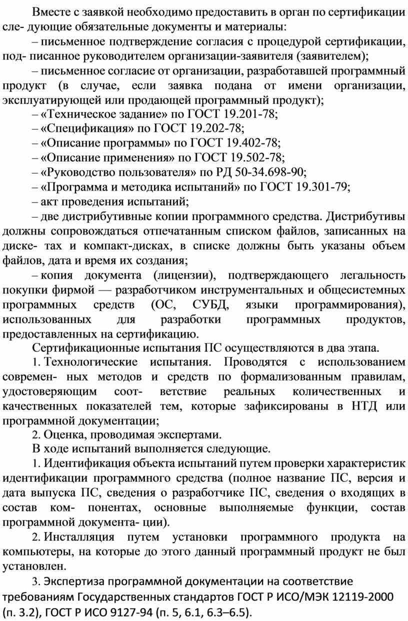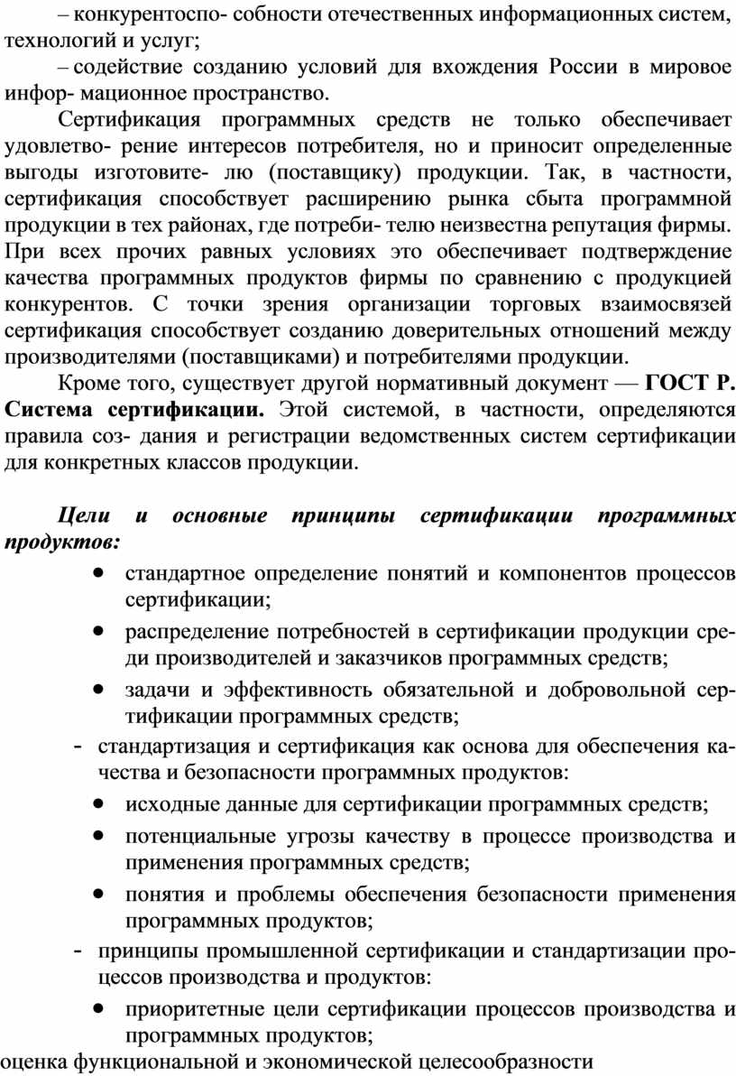 Рынок программных средств в России сейчас настолько разнообразен, что в подавляющем большинстве случаев потребитель не в состоянии самостоя- тельно убедиться в соответствии приобретаемой им продукции установленным на государственном уровне нормам и правилам. В результате можно купить программный продукт, который в дальнейшем окажется неработоспособным, а в лучшем случае его эксплуатация будет сопряжена с технологическими, фи- нансовыми и организационными трудностями. Класс подобных проблем реша- ется посредством сертификации.