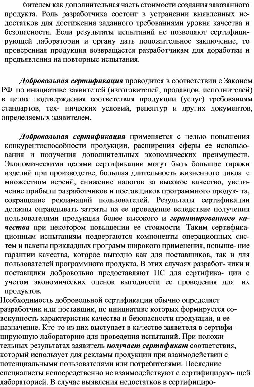 Сертификация программных средств не только обеспечивает удовлетво- рение интересов потребителя, но и приносит определенные выгоды изготовите- лю (поставщику) продукции. Так, в частности, сертификация способствует расширению рынка сбыта программной продукции в тех районах, где потреби- телю неизвестна репутация фирмы. При всех прочих равных условиях это обеспечивает подтверждение качества программных продуктов фирмы по сравнению с продукцией конкурентов. С точки зрения организации торговых взаимосвязей сертификация способствует созданию доверительных отношений между производителями (поставщиками) и потребителями продукции.