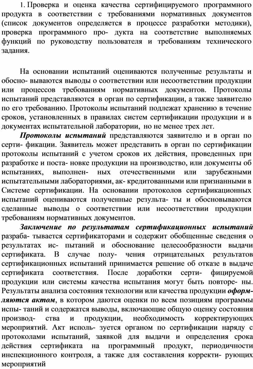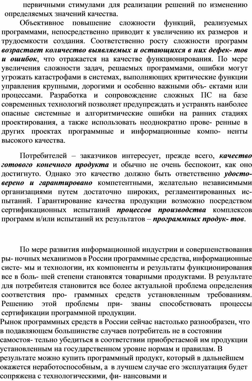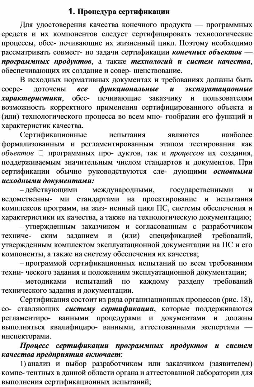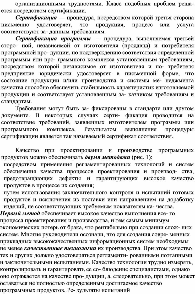 Потребителей – заказчиков интересует, прежде всего, качество готового конечного продукта и обычно не очень беспокоит, как оно достигнуто. Однако это качество должно быть ответственно удосто- верено и гарантировано компетентными, желательно независимыми организациями путем достаточно широких, регламентированных ис- пытаний. Гарантирование качества продукции возможно посредством сертификационных испытаний процессов производства комплексов программ и/или испытаний их результатов – программных продук- тов.