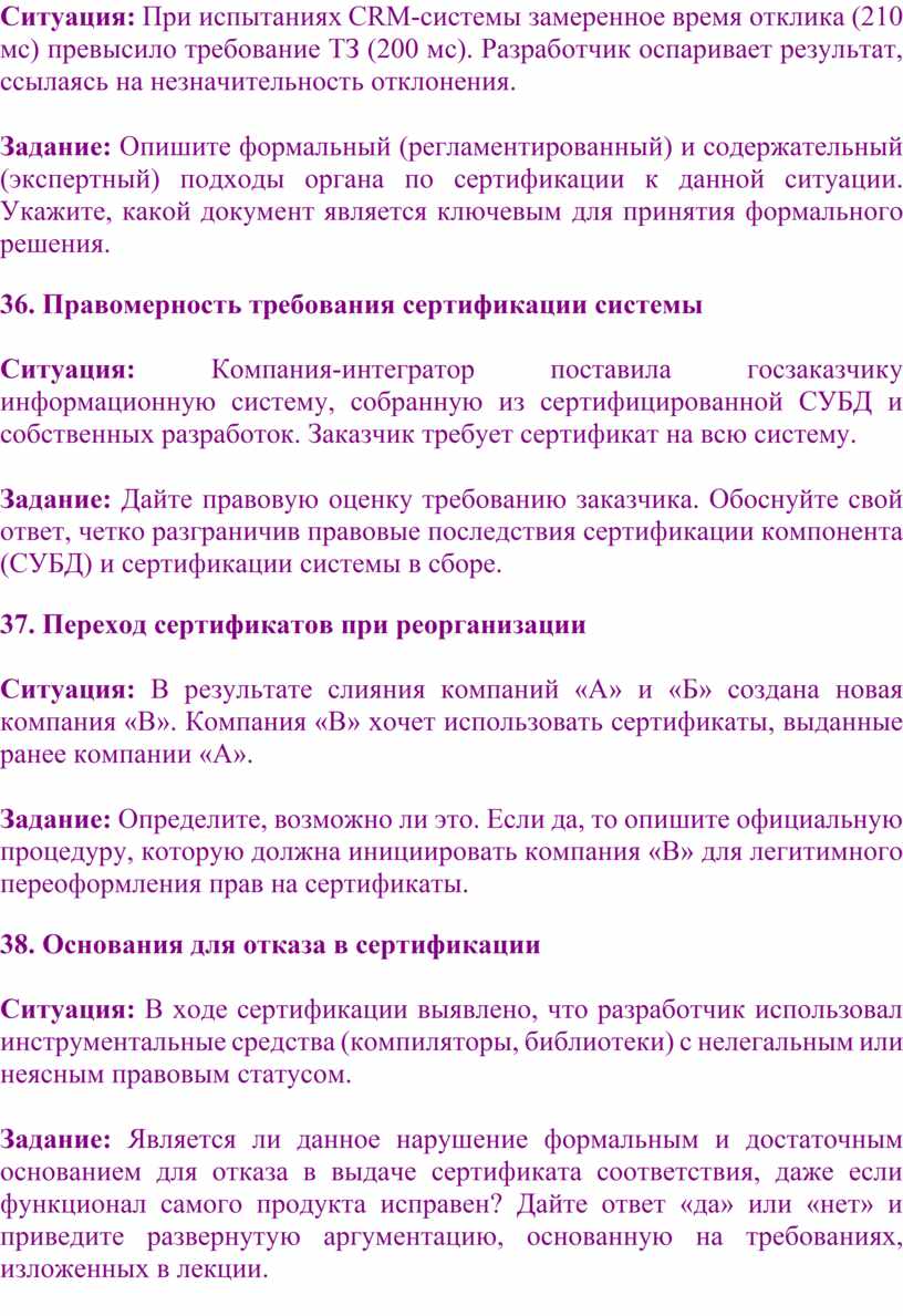 Задание: Дайте правовую оценку требованию заказчика. Обоснуйте свой ответ, четко разграничив правовые последствия сертификации компонента (СУБД) и сертификации системы в сборе.