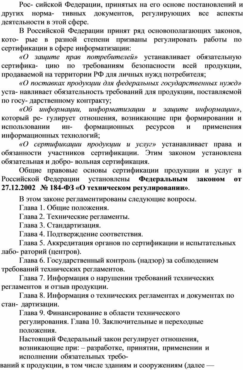 Общие правовые основы сертификации продукции и услуг в Российской Федерации установлены Федеральным законом от 27.12.2002 № 184-ФЗ «О техническом регулировании».