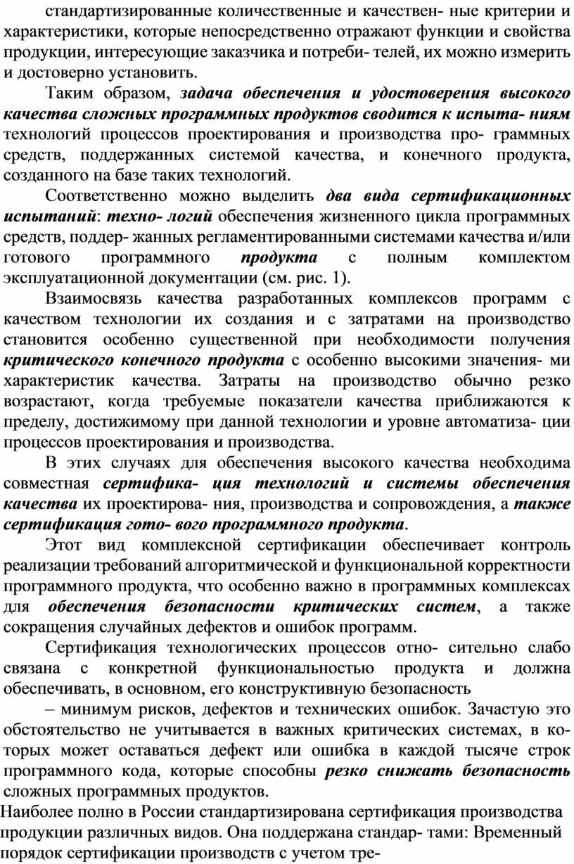 Соответственно можно выделить два вида сертификационных испытаний: техно- логий обеспечения жизненного цикла программных средств, поддер- жанных регламентированными системами качества и/или готового программного продукта с полным комплектом эксплуатационной документации (см. рис. 1).