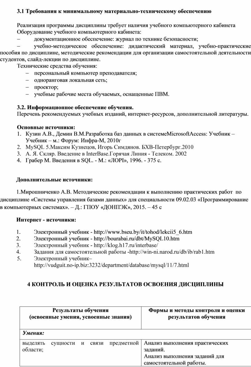 1.Мирошниченко А.В. Методические рекомендации к выполнению практических работ по дисциплине «Системы управления базами данных» для специальности 09.02.03 «Программирование в компьютерных системах». – Д.: ГПОУ «ДОНПЭК», 2015. – 45 с