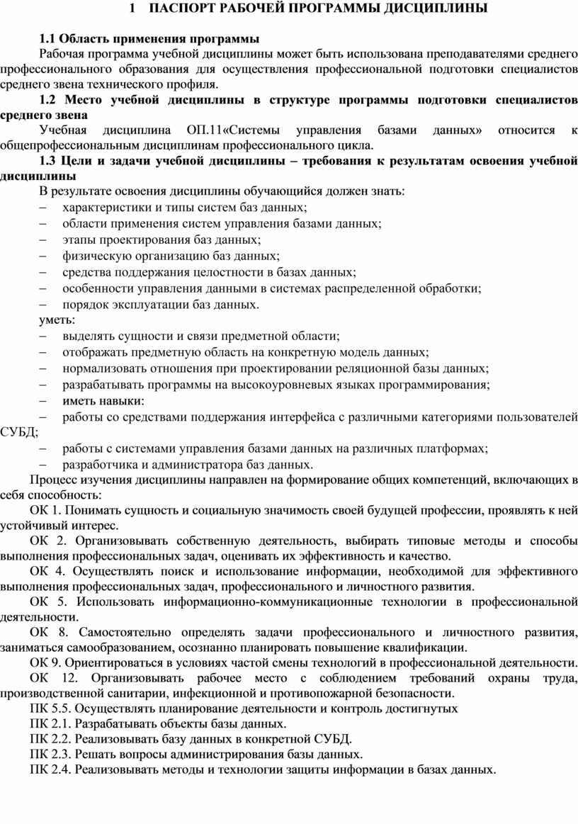 Учебная дисциплина ОП.11«Системы управления базами данных» относится к общепрофессиональным дисциплинам профессионального цикла.