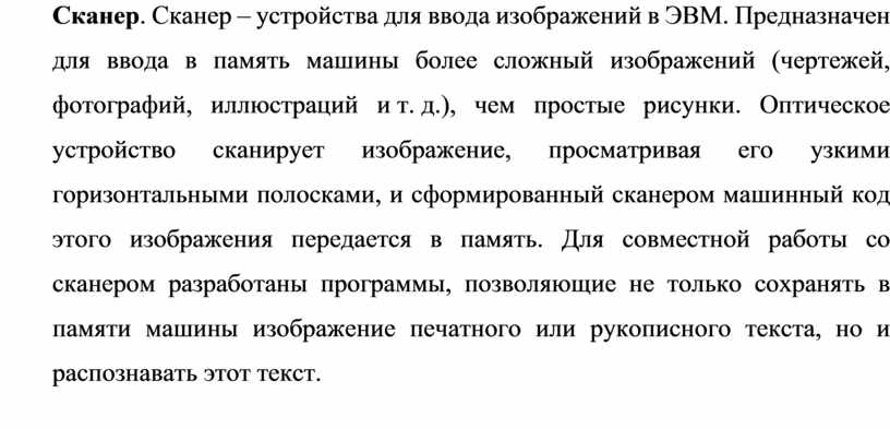 Сканер. Сканер – устройства для ввода изображений в ЭВМ. Предназначен для ввода в память машины более сложный изображений (чертежей, фотографий, иллюстраций и т. д.), чем простые рисунки. Оптическое устройство сканирует изображение, просматривая его узкими горизонтальными полосками, и сформированный сканером машинный код этого изображения передается в память. Для совместной работы со сканером разработаны программы, позволяющие не только сохранять в памяти машины изображение печатного или рукописного текста, но и распознавать этот текст.
