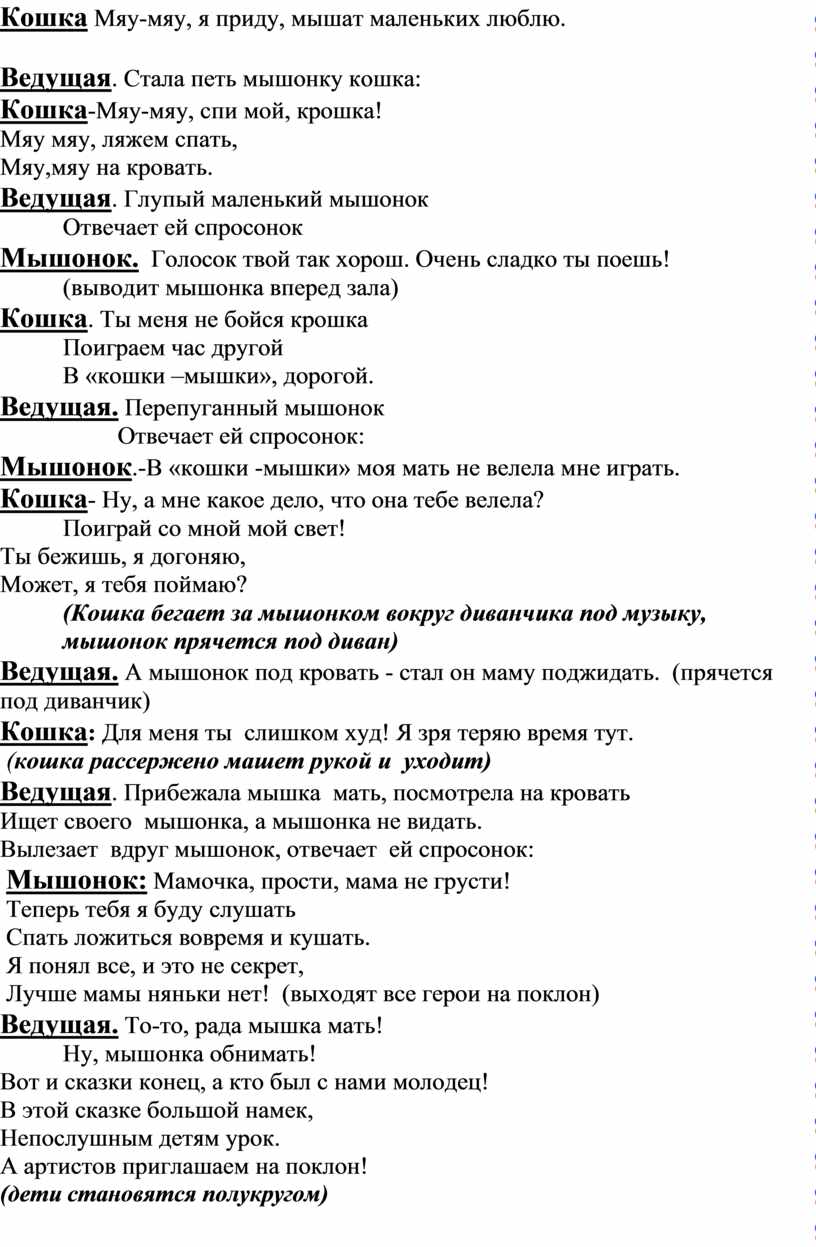 Ведущая. Побежала мышка мать, стала кошку в няньки звать